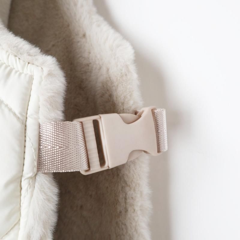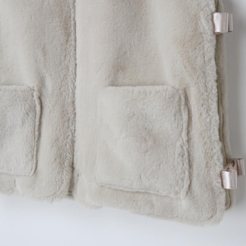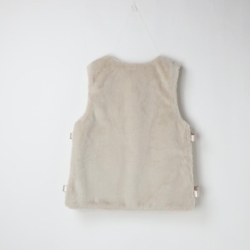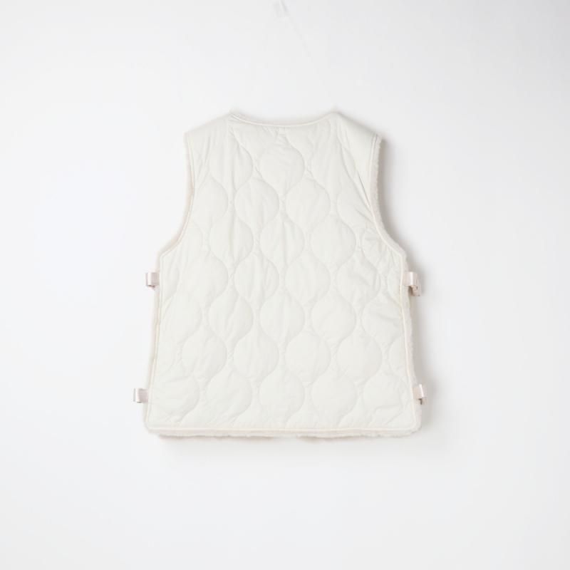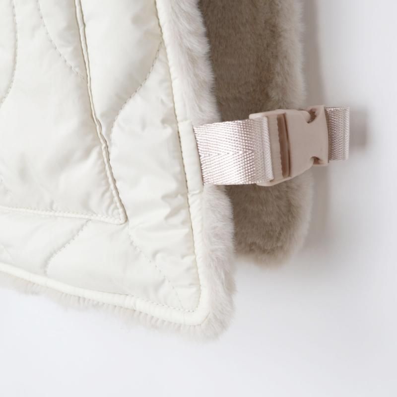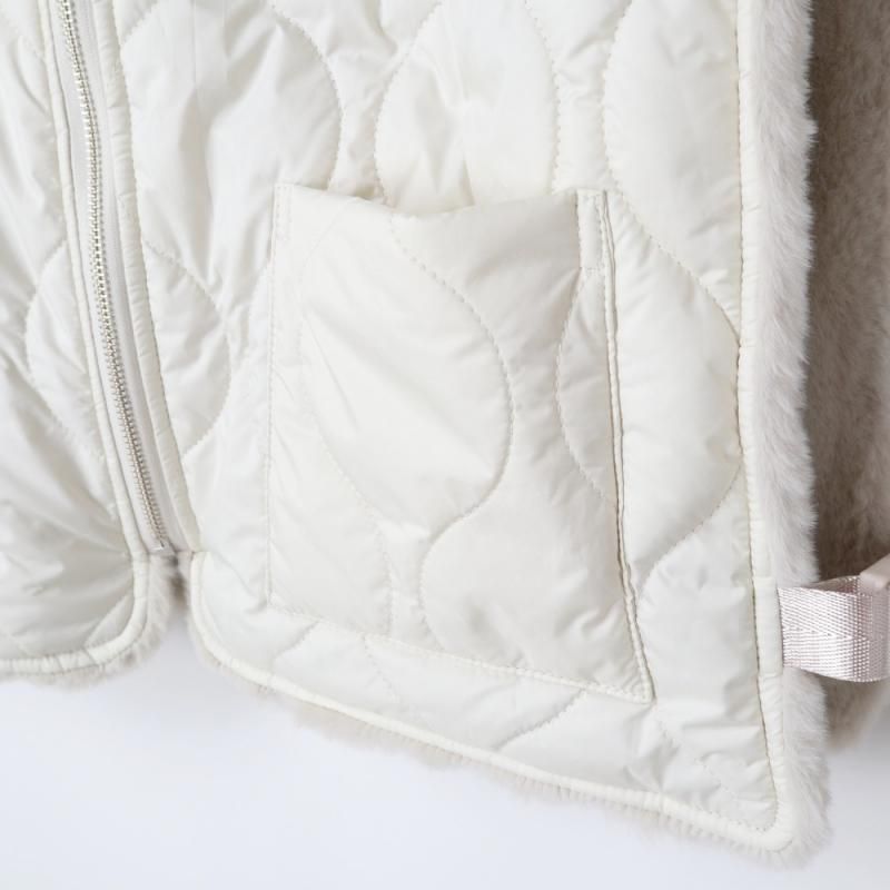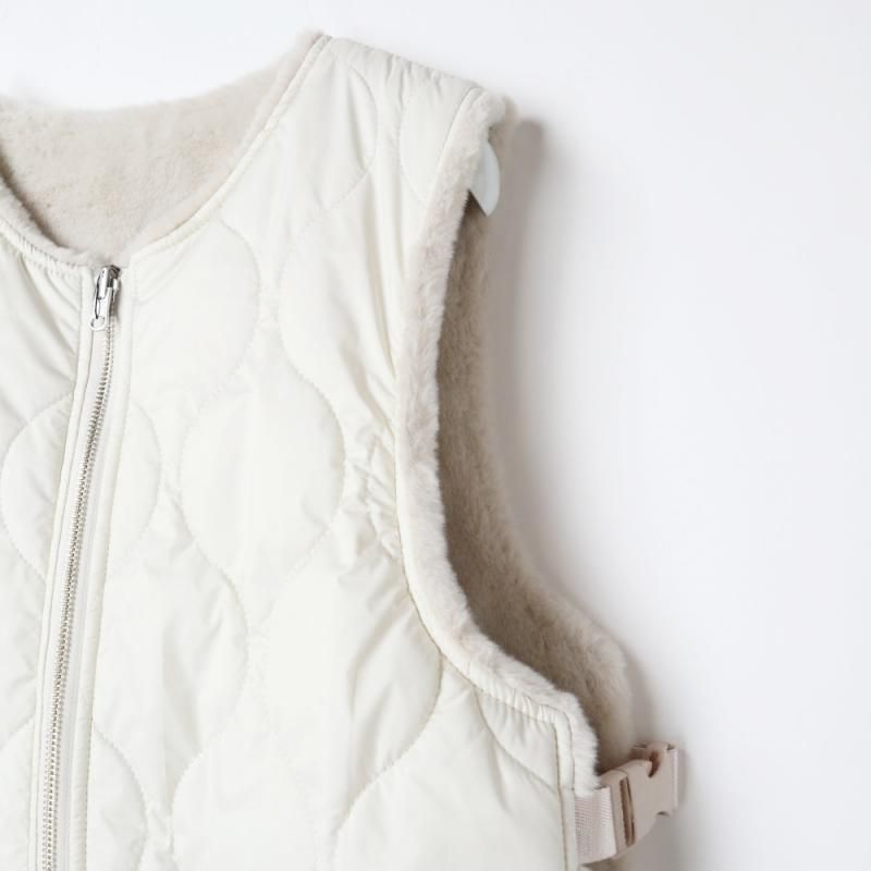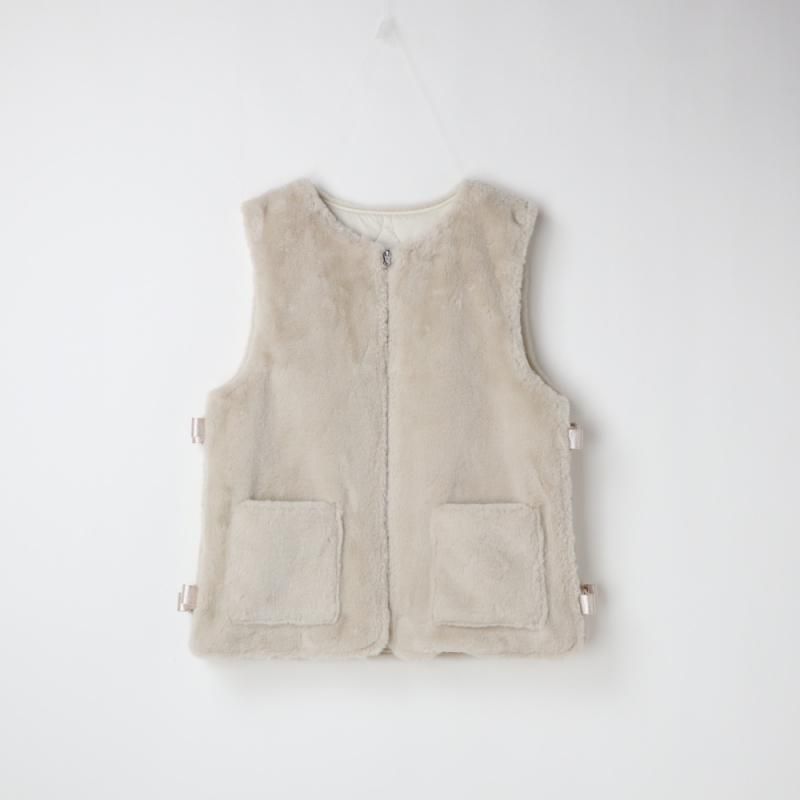 肌触りの滑らかな短毛のフェイクファーと薄手のタフタ生地をキルティングした裏表2WAYのベスト。