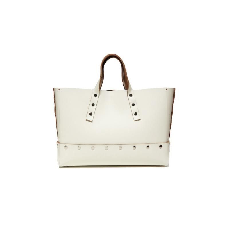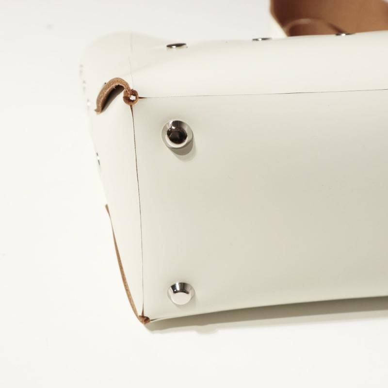 見た目にも印象的なデザインは、裁断したレザーをステッチを用いずにリベットで留めてくみ上げたデザインのバッグ。