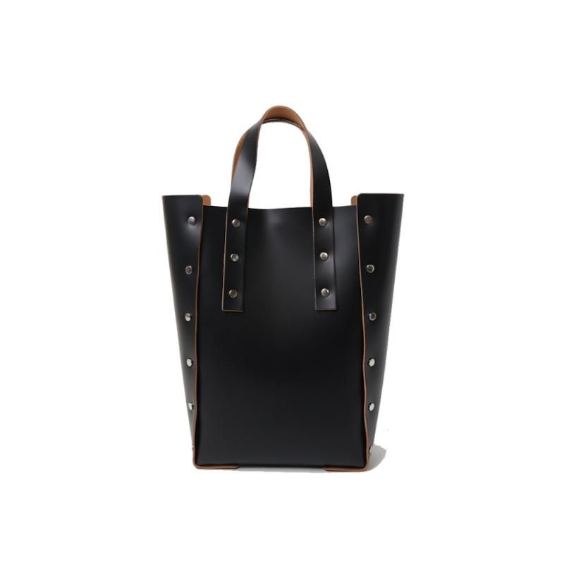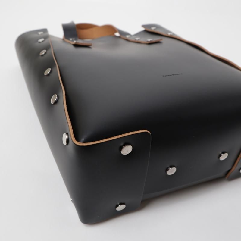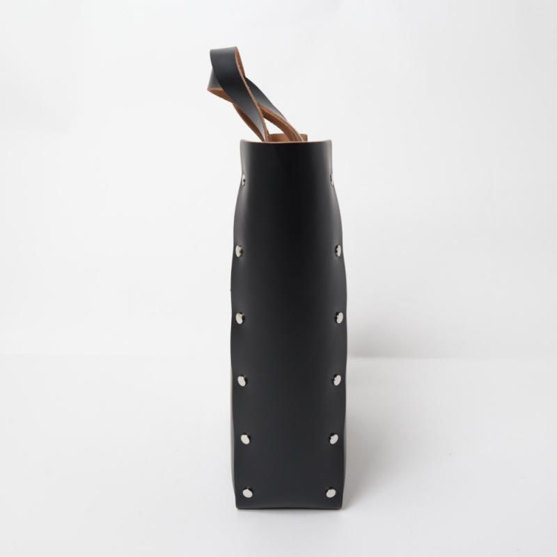 見た目にも印象的なデザインは裁断したレザーをステッチを用いずにリベットで留めてくみ上げたデザイン。