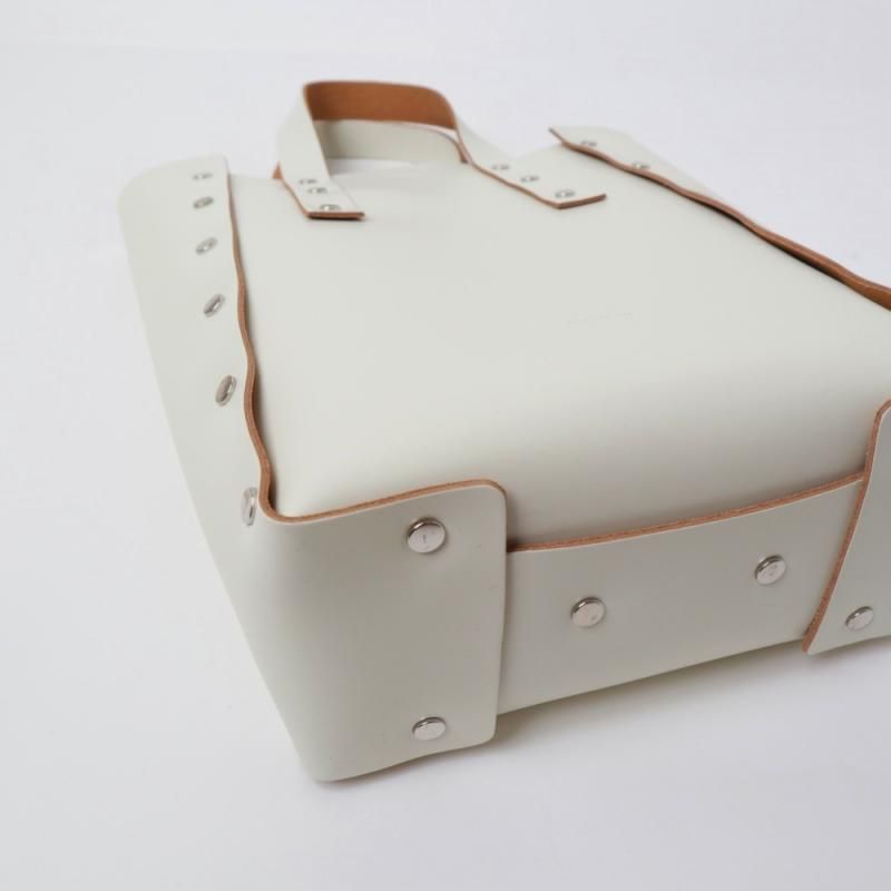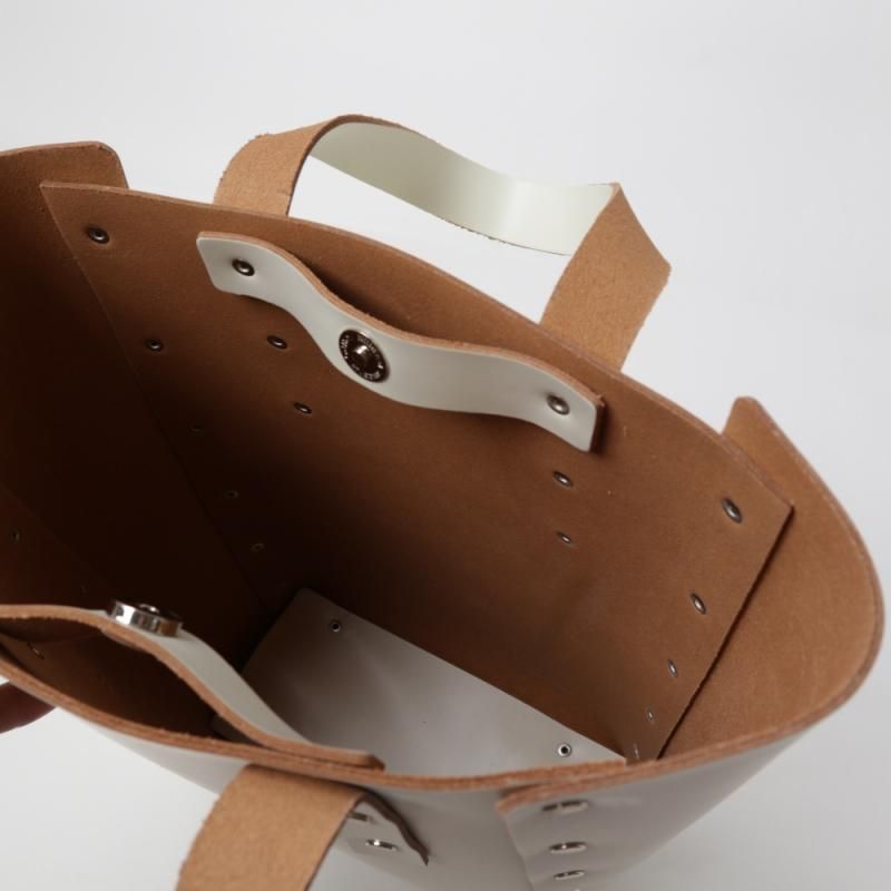 素材にはガラスレザーを採用し、さらりとした質感の表面と、無染色のレザーの表情が見える裏面とのコントラストも特徴。