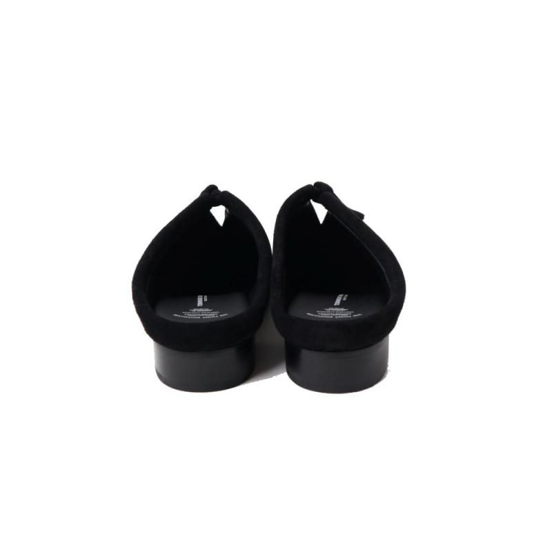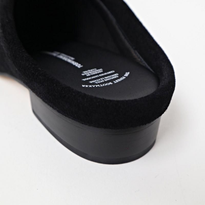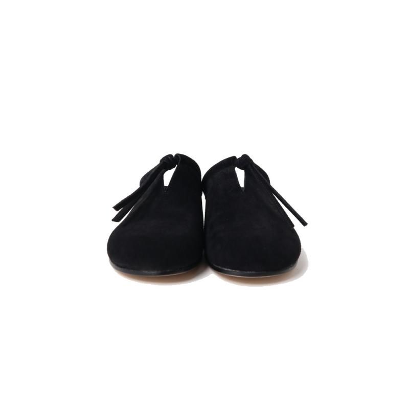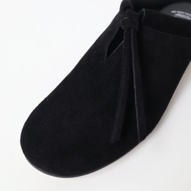 スライドの口周りに配された革紐の結びでフィッティングを調整できる機能を備えた、サボ風のミュールサンダルです。