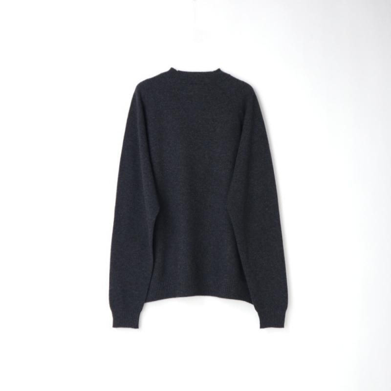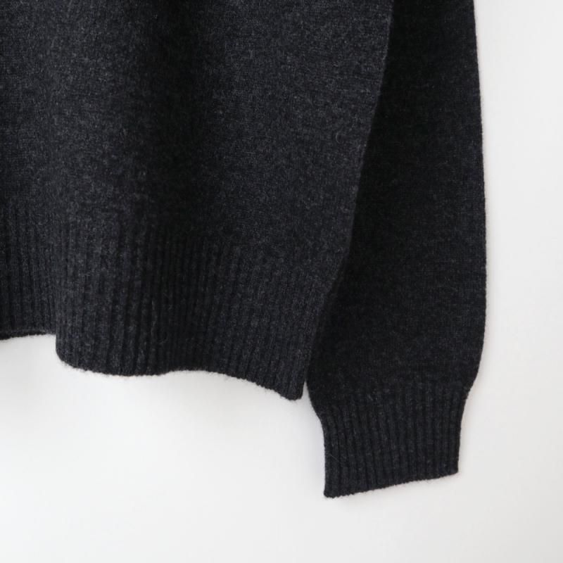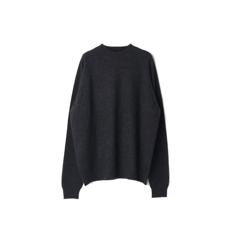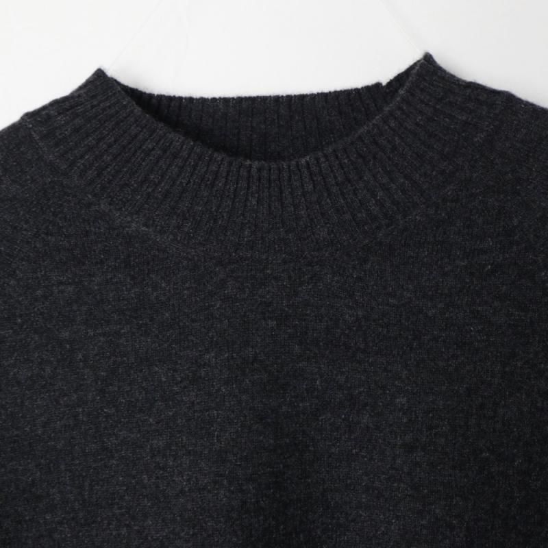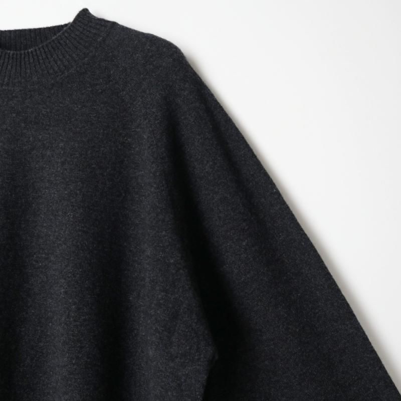 シルエットは非常にベーシックなものですが、詰まったネックバランスやホールガーメントの編みたてと、シンプルながらも細部に趣向を凝らしたholkらしい一枚。