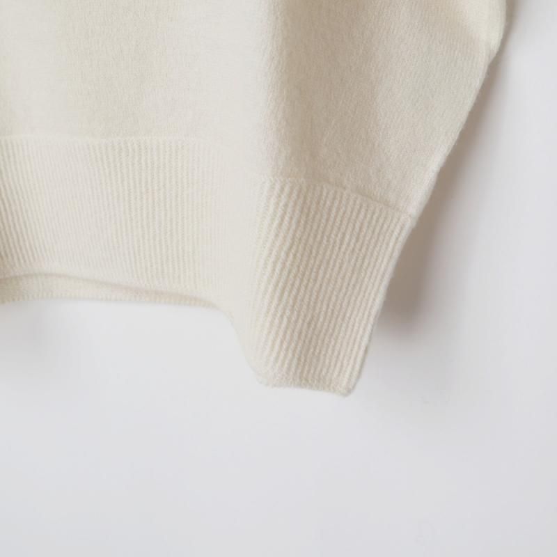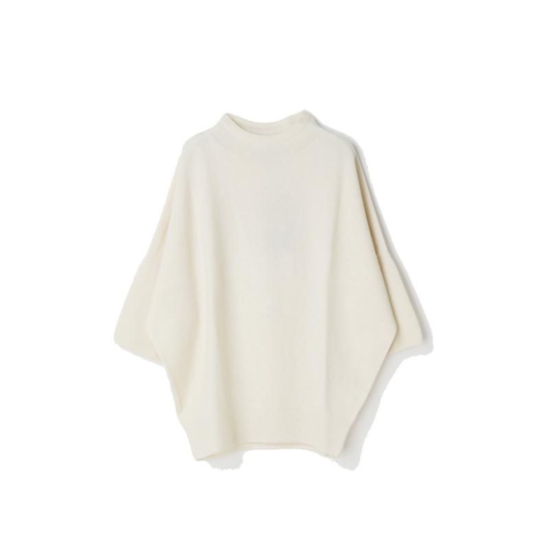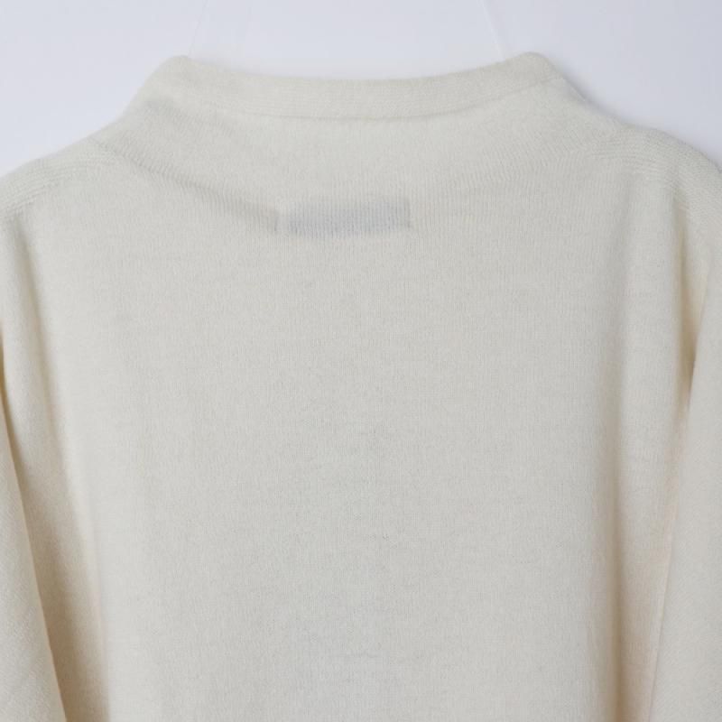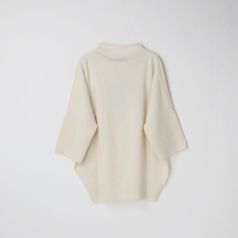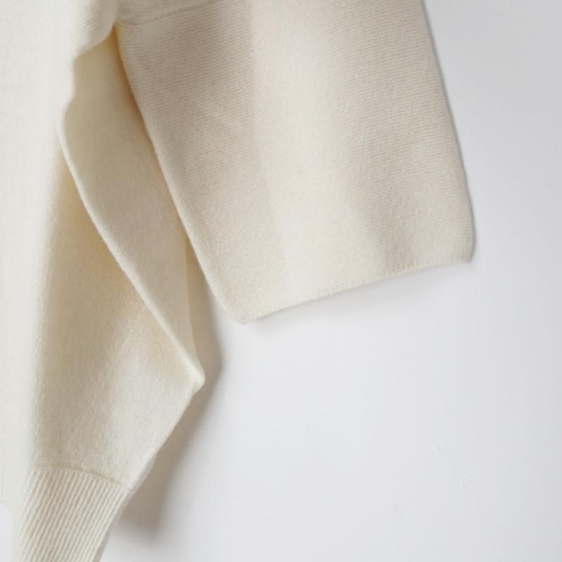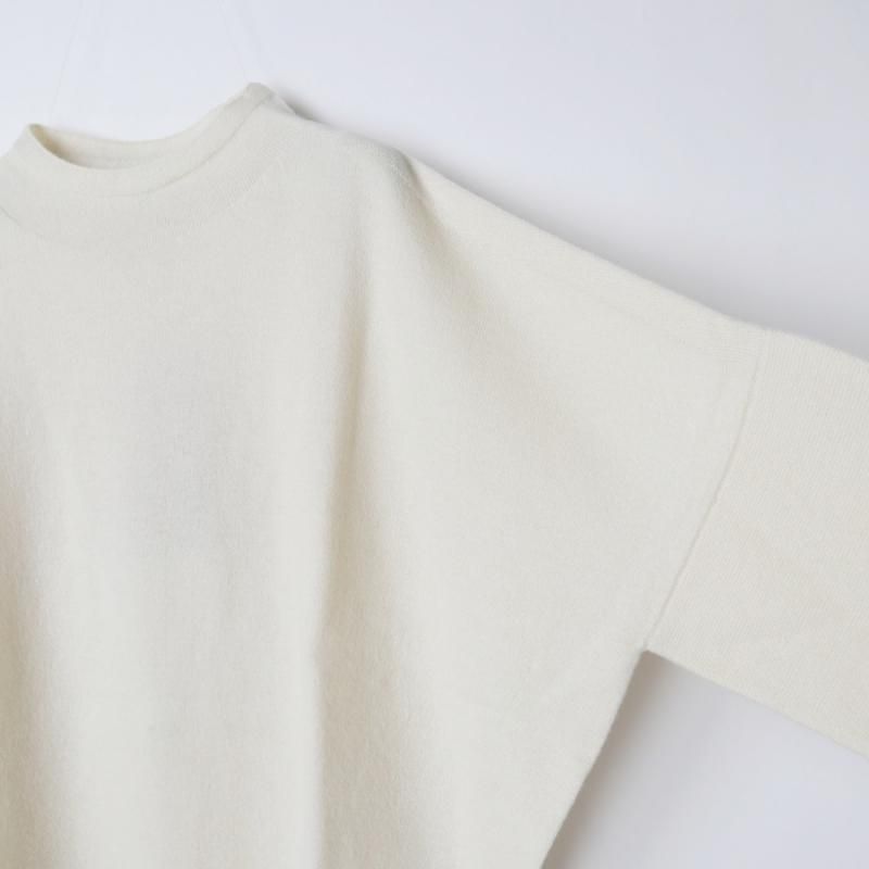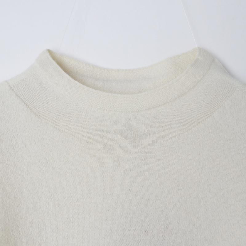 ホールガーメントならではの縫い目のないモックネックや、コクーンシルエットがミニマルながら細部に磨きをかけた一枚です。