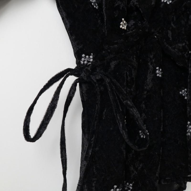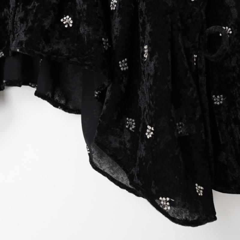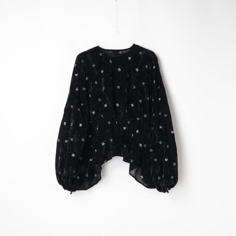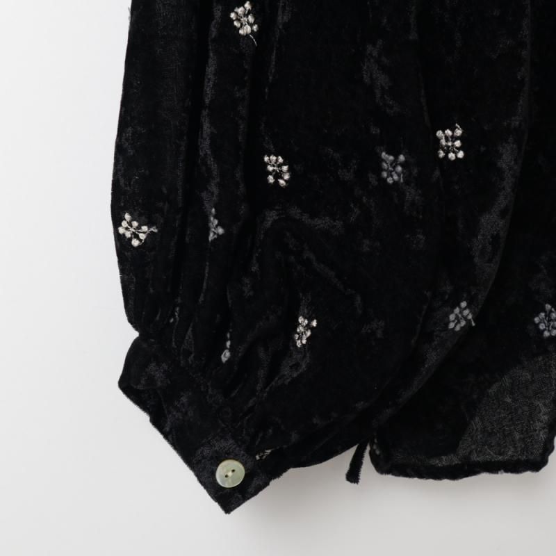 立体感のある繊細な刺しゅうとタックを入れた裾が広がるシルエットのブラウス。