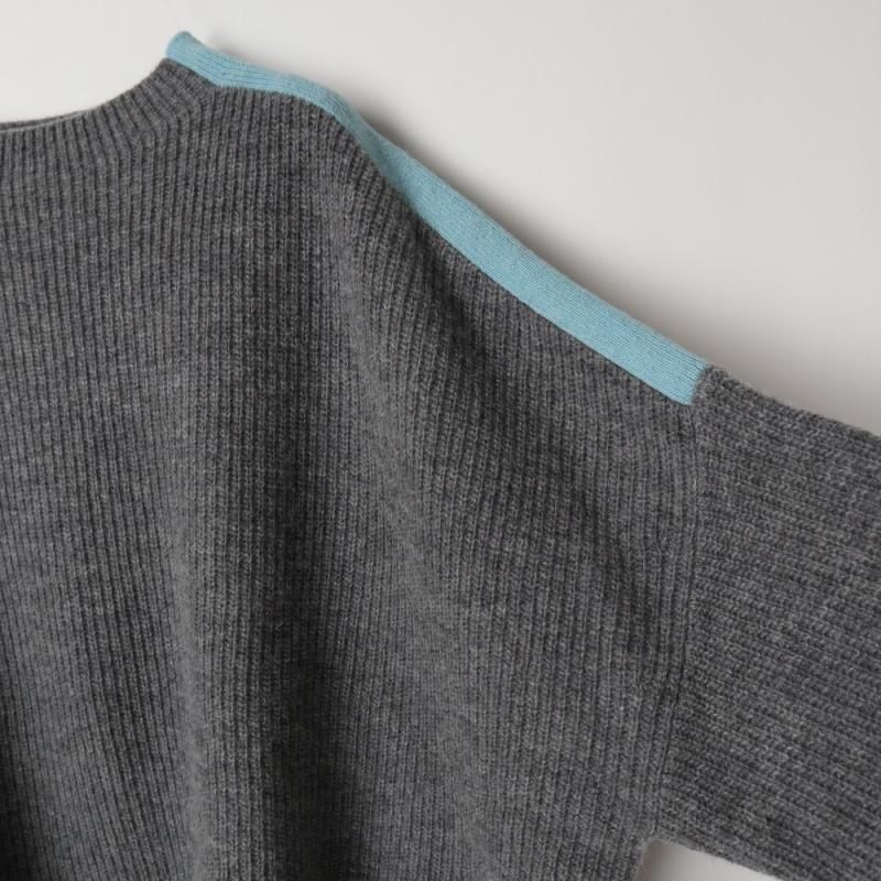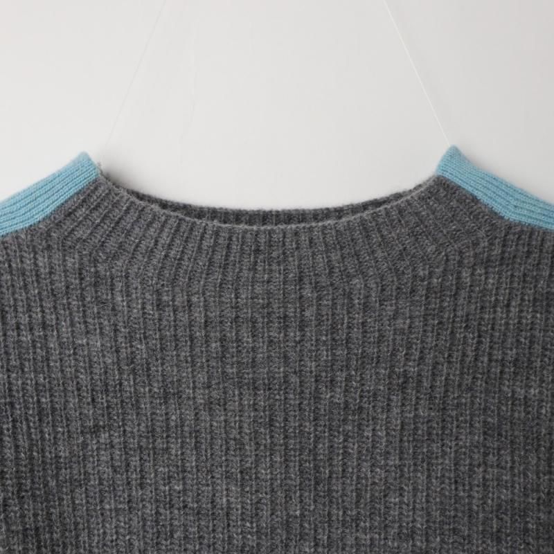 首に沿うようにゆったりと立ち上がったネックに、肩からネックにかけて施したカラーラインがシャープな印象に。