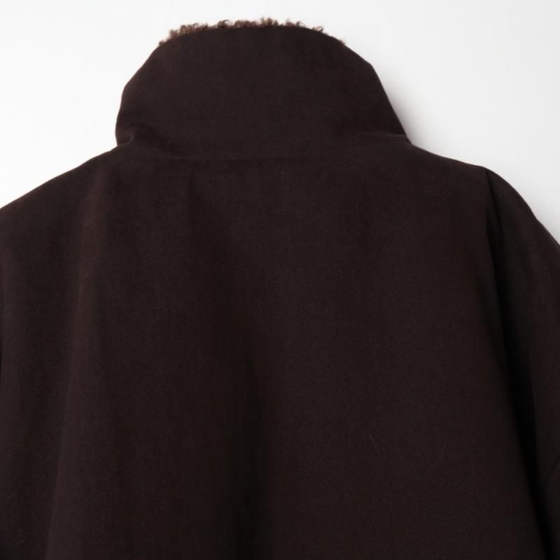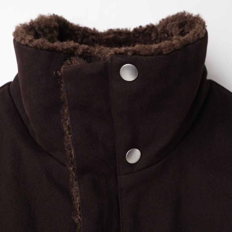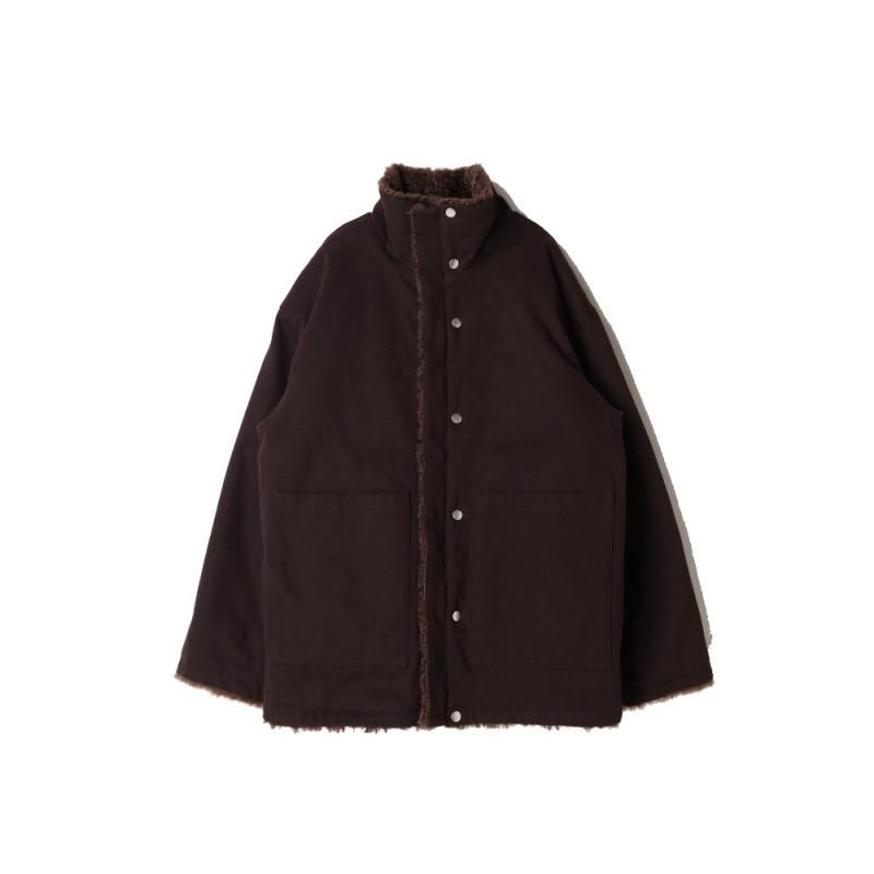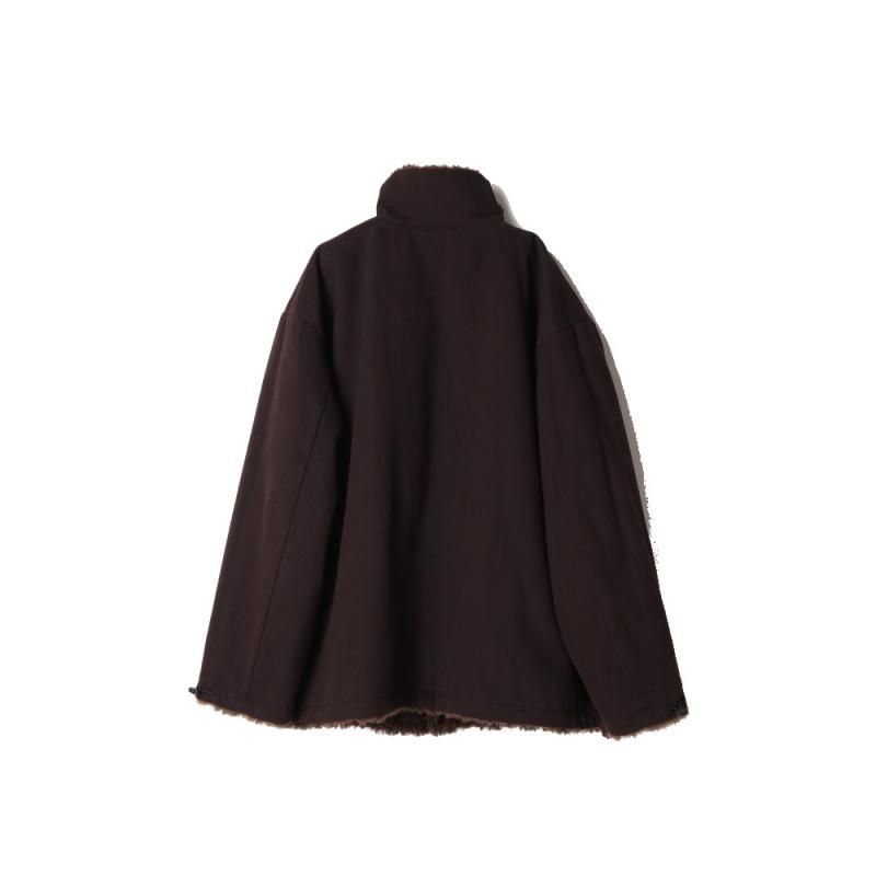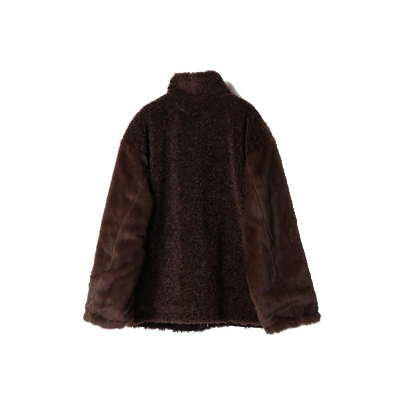 ファーとボアが組み合わさった面と、少し起毛感のあるコットンチノ素材面をリバーシブルで楽しめるブルゾンコート。